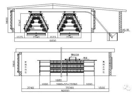 以一棟一萬雞計(jì)算,采用四層階梯式蛋雞比較劃算,則雞舍的尺寸采用80米長、9米寬、3米高。